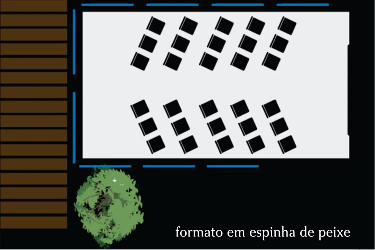 Nossa sala de reunião oferece flexibilidade de configurações para atender às suas necessidades. Em formato U, ela acomoda até 20 pessoas, ideal para debates mais interativos e dinâmicas. Já na disposição em espinha de peixe, a capacidade aumenta para até 30 participantes, proporcionando um ambiente confortável e funcional para treinamentos, workshops e encontros de negócios.